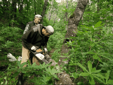 The roof above the stove is moving towards its last months. Originally a nice, clean, wooden structure, it has now the color of a chainsmoker's lungs. For the first time in the history of the farm, it needs replacement. First step: chopping down wood. With a chainsaw and a few axes on our shoulders we hike to the woods, a 30 minutes walk up hill from the farm.
